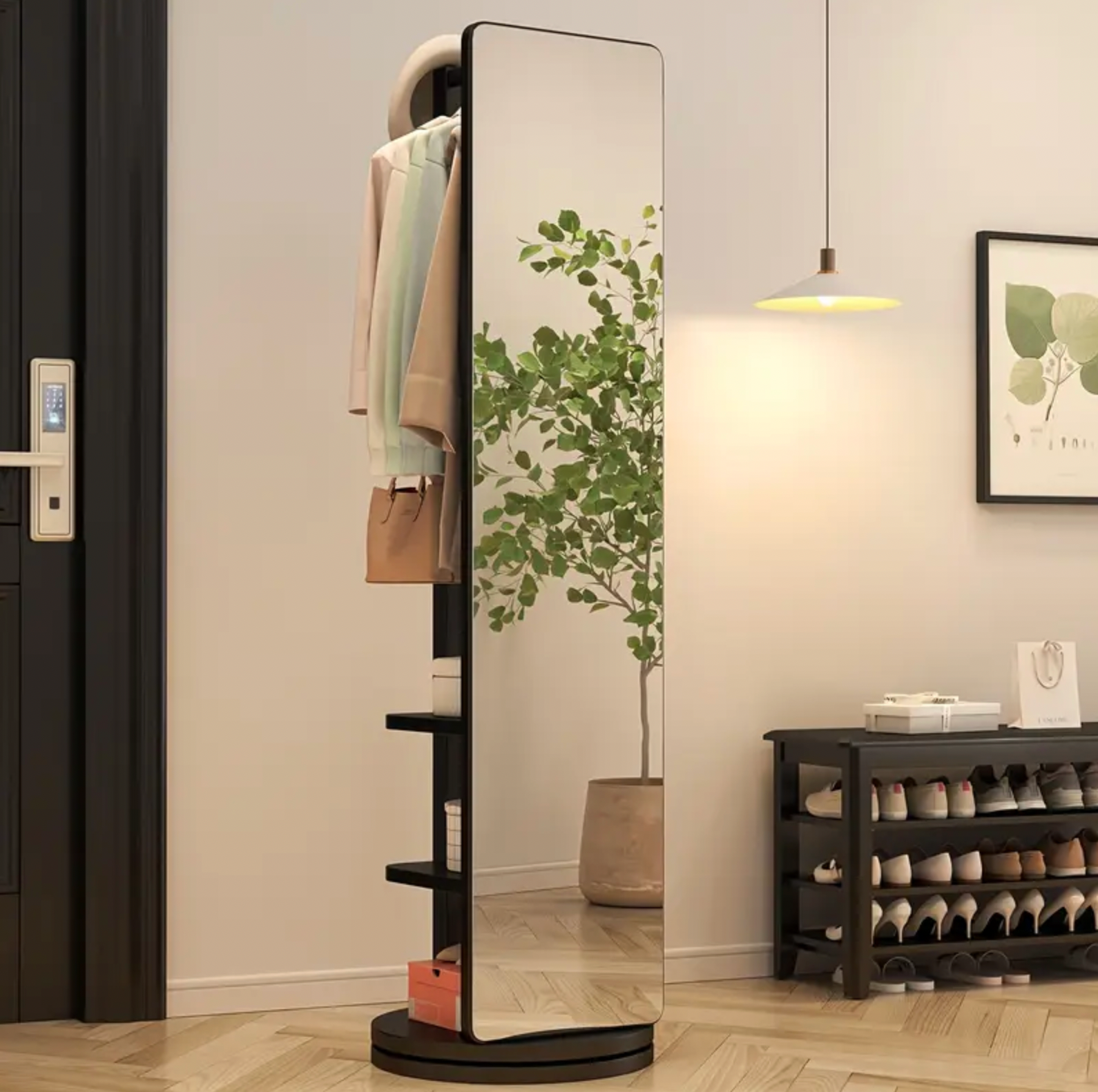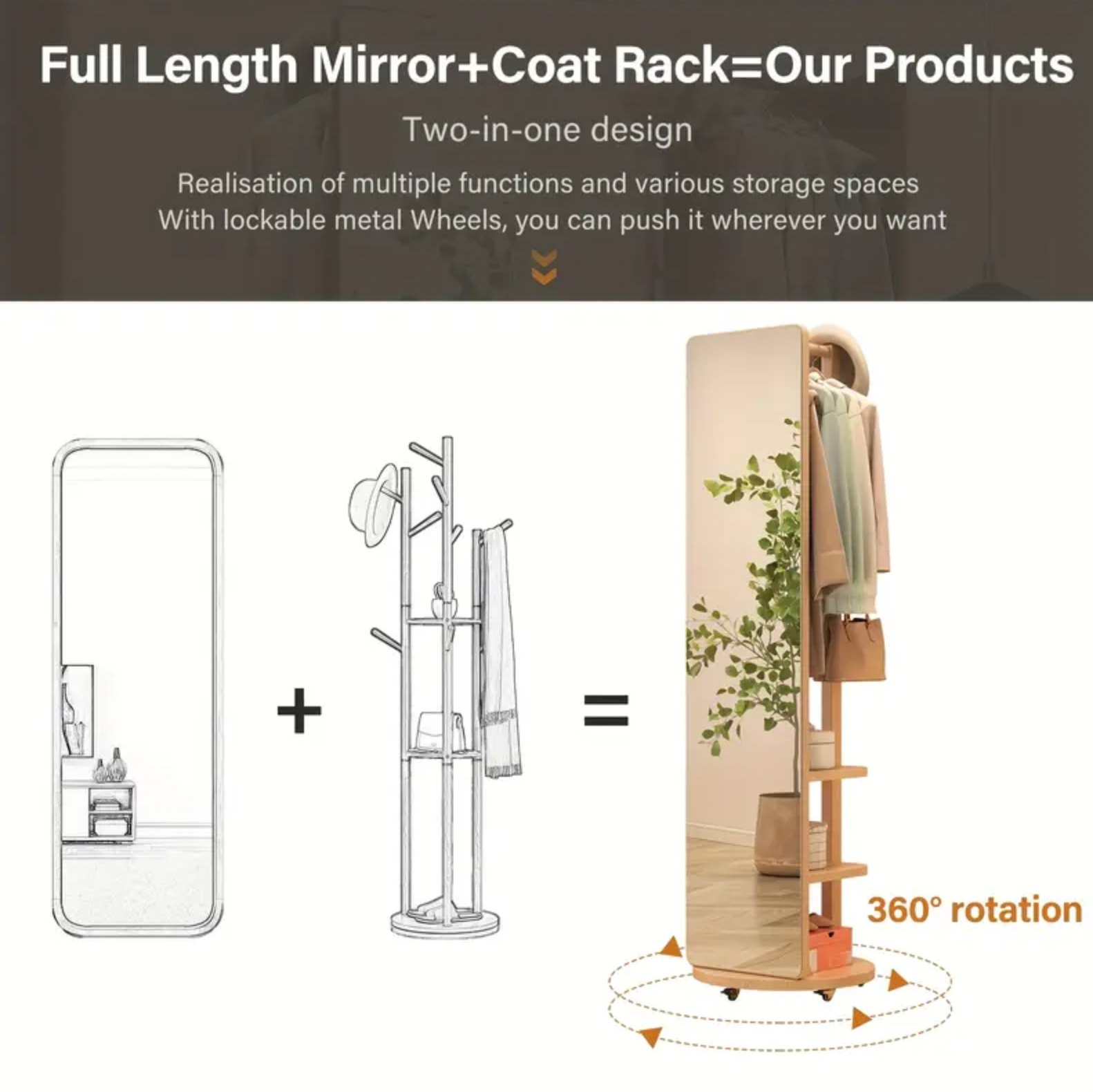 DESIGN 2-EN-1 : Ce miroir sur pied avec support intégré combine un porte-manteau pivotant à 360°, des étagères et un miroir pleine longueur, permettant de gagner de la place. Idéal pour les chambres, salons, couloirs, boutiques de vêtements, etc.