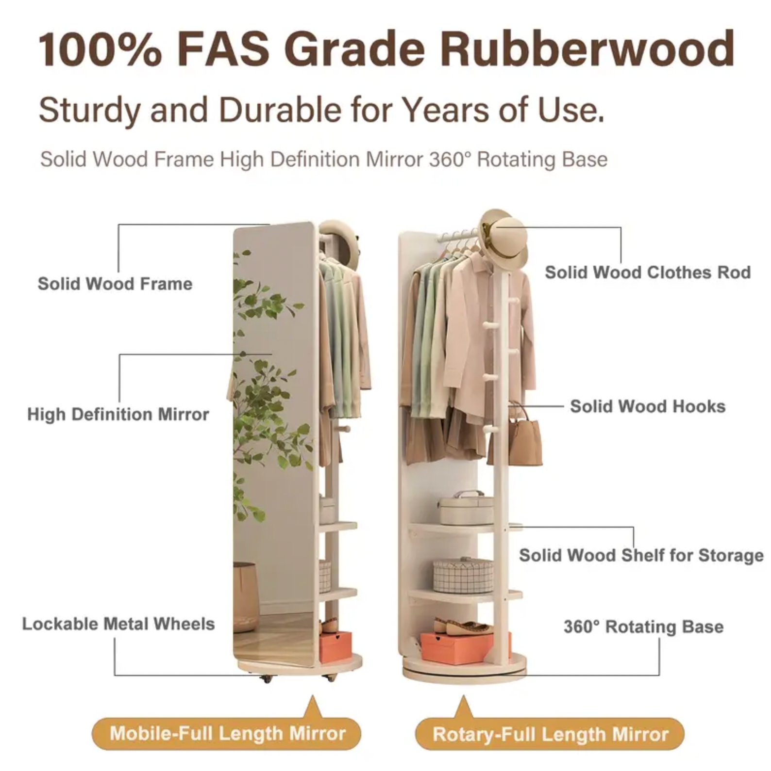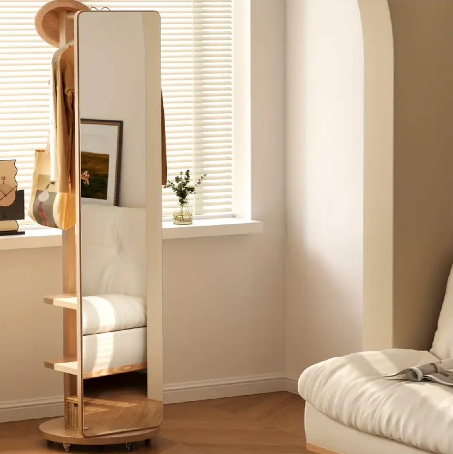 Miroir sur Pied en Bois Massif – Pivotant avec Porte-Manteau